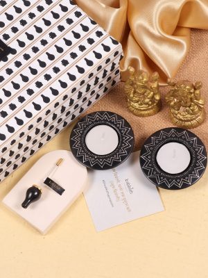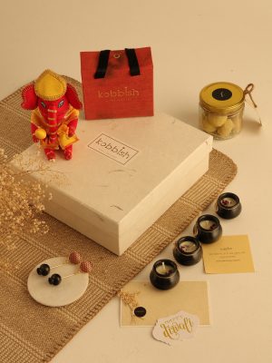 Our Kabbish Diwali hamper is a thoughtfully curated combo of handcrafted goodies. Kabbish accessories with handi diyas- (black pottery candles with rose fragrance) and traditional snack – (Naan-Khatai), in a recycled paper box, will make a perfect gift for your loved ones.
