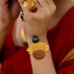 Each piece of our jewellery holds a glimpse of Natraj draping a zari embroidered silk sari dancing vicariously. Whether in the case of man or woman, the pleats in the garment that fans out during the dance movements adds an exceptional beauty to the dance. Plated in 22 carat gold with extraordinary craftsmanship of our artisans, have successfully achieved the perfect Bharatnatyam designs.